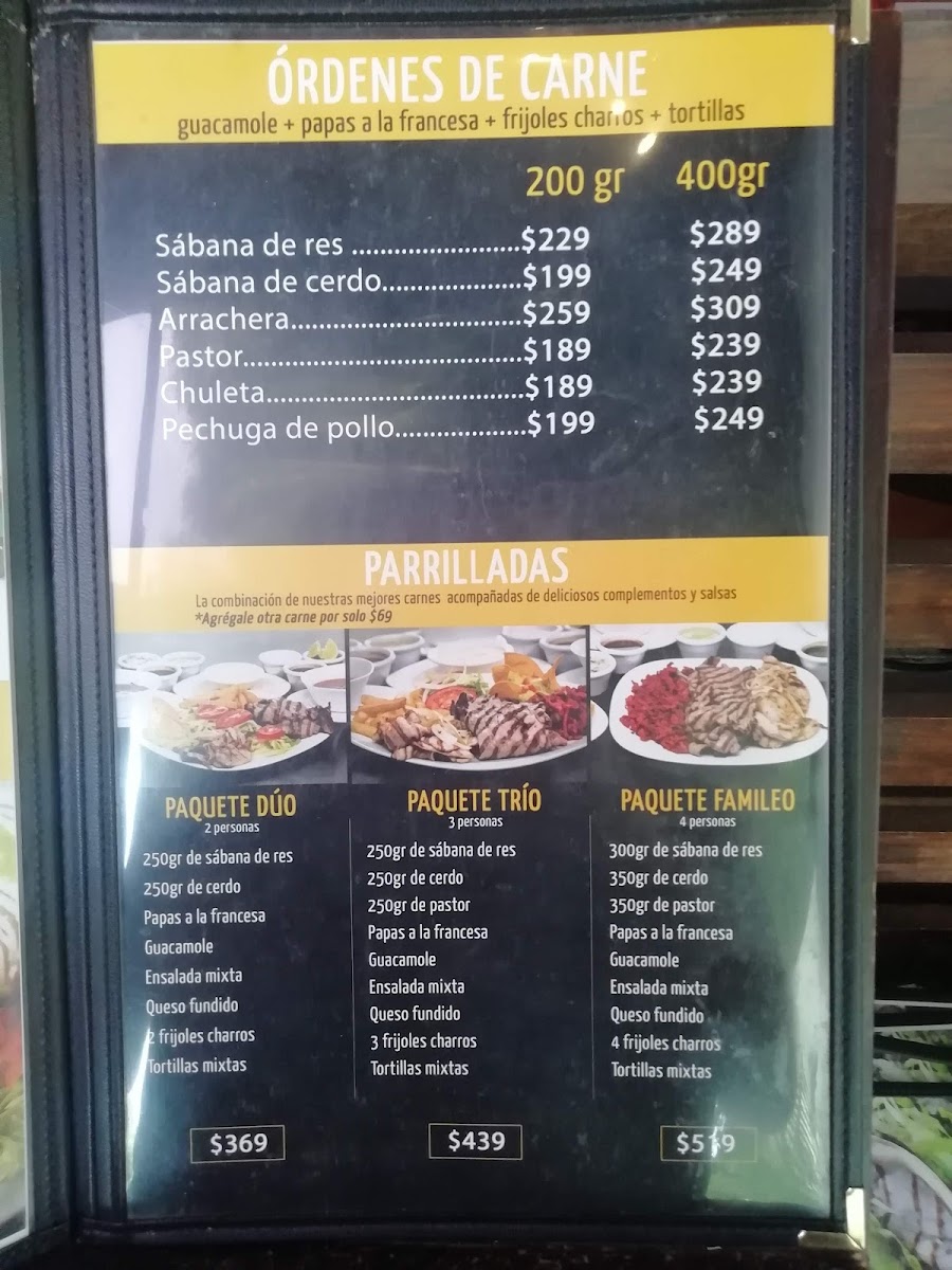 Parrillada para 3 personas, 250 gr de sábana de res, 250 gr de cerdo, 250 gr de pastor, papas a la francesa, gucamole, ensalada mixta, queso fundido, 3 frijoles charros, tortillas mixtas.